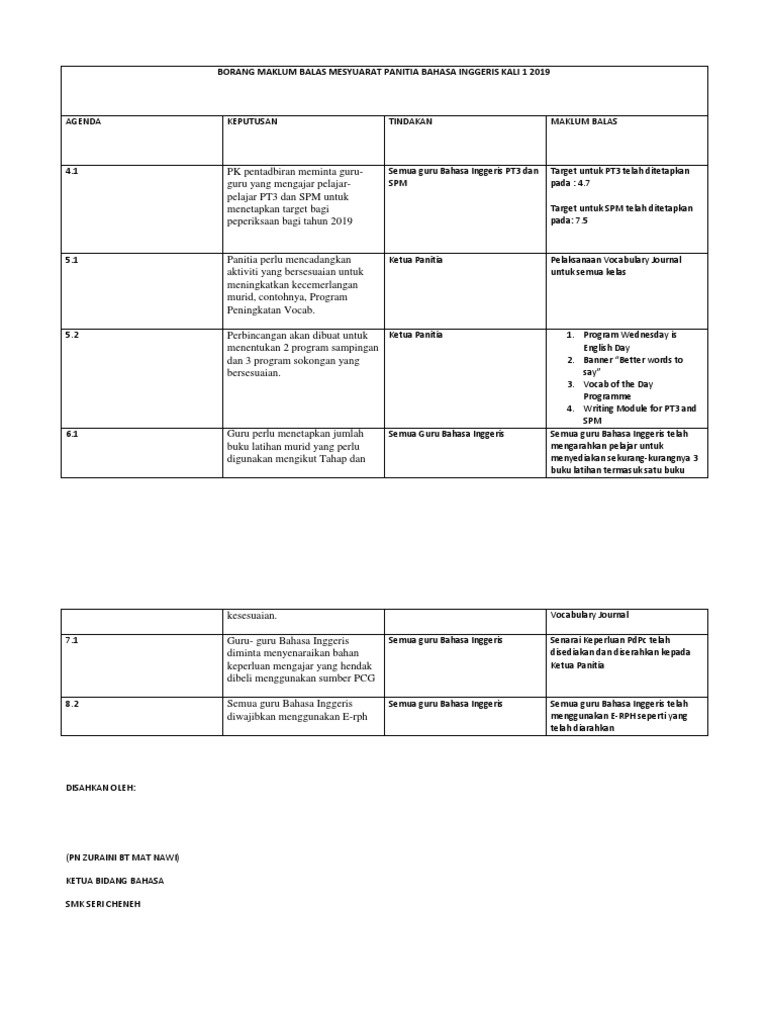 Borang Maklum Balas Mesyuarat Panitia Bahasa Inggeris Kali 1 2019 Pdf